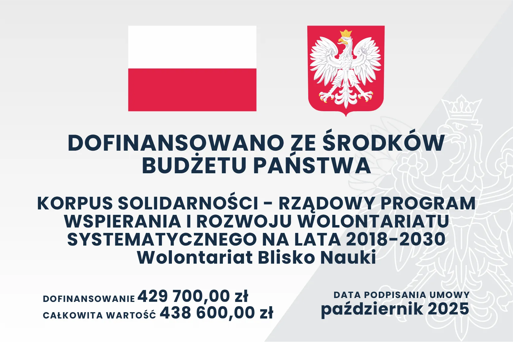 Program jest częścią zadania publicznego pn. "Wolontariat Blisko Nauki" realizowanego w okresie od 1.09.2025 roku do 31.08.2028 roku ze środków Narodowego Instytutu Wolności - Centrum Rozwoju Społeczeństwa Obywatelskiego.